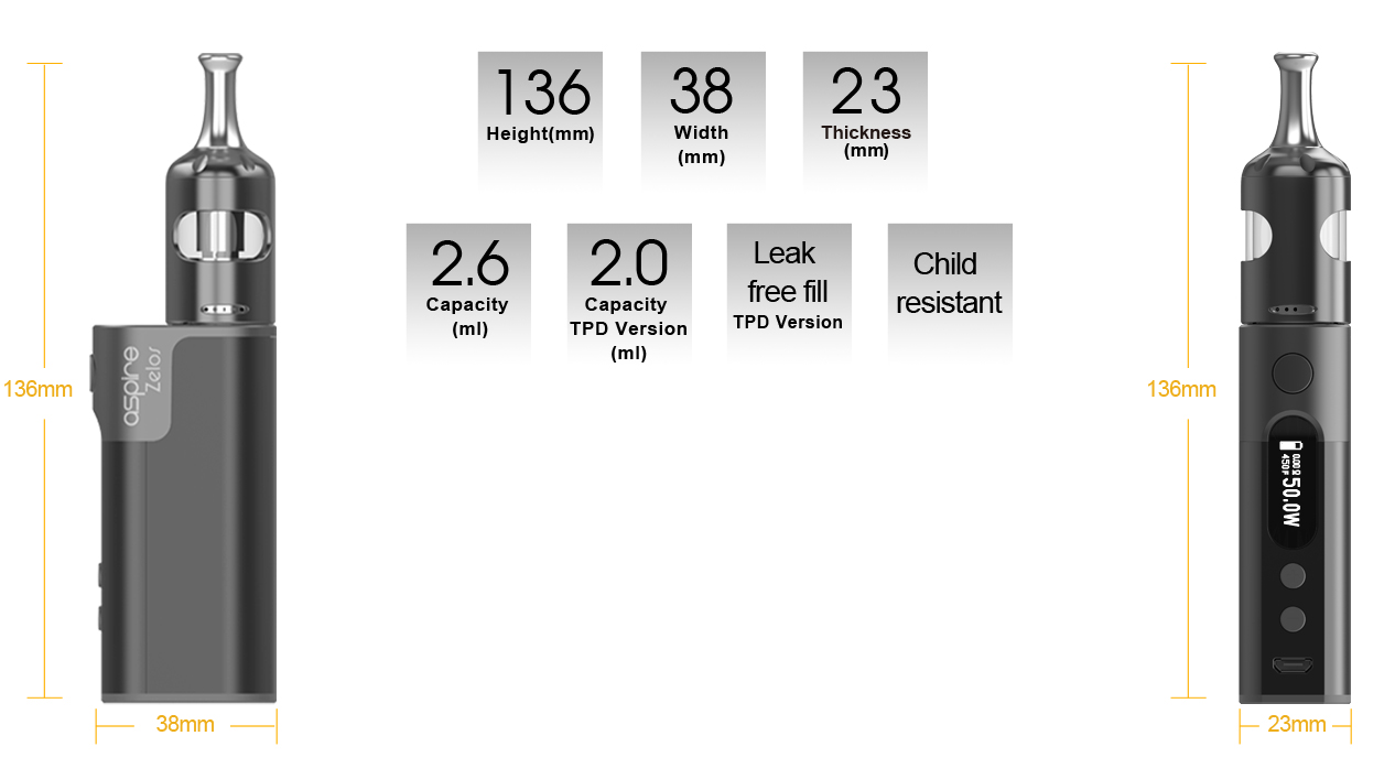 Aspire Zelos 2 Kit yeni başlayanların hayalidir,yani kullanımı basit ama yine de oldukça işlevseldir. Zelos 2.0 Kit,Aspire Zelos Box Mod ve Nautilus 2S Tankından oluşmaktadır. Mikro USB portu ile şarj edilmiş yerleşik 2500mAh pil ile çalışan Zelos Box Mod,maksimum 50W çıkışa kadar ateşleyebilir ve Ni200,Titanyum ve Paslanmaz Çelik ısıtma elemanları için sıcaklık kontrol desteğiyle çeşitli çıkış modlarını destekler. 0,69 inç OLED Ekranı,yararlı operasyonel bilgileri açıkça gösteren organize bir matrise sahiptir. İçerdiği Nautilus 2S Tankı,22 mm çapa sahip ve vurgusu doğrudan akciğer boşluğuna yönelik bir 0.4ohm BVC coili ve ağızdan ciğer buharına doğru bir 1.8ohm BVC coilidir.