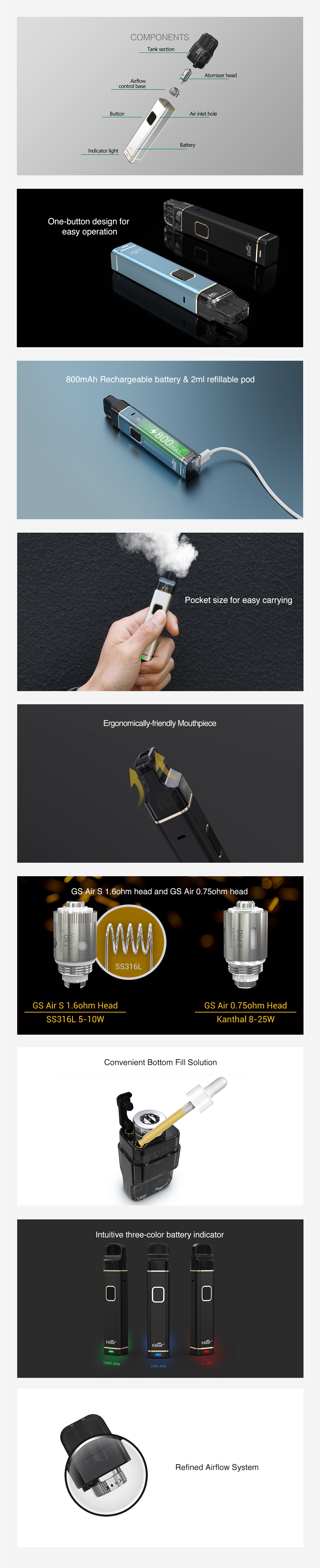 Eleaf iTap Pod hareket halindeyken kullanım için zarif ve taşınabilir bir cihazdır! Eleaf iTap,tamamen şarj edildiğinde size dayanıklı buhar deneyimi sunabilen yerleşik 800mAh pil ile birlikte gelir. Sezgisel üç renkli pil göstergesi ile,pil durumunu bilmek çok kolay. Yenilikçi kuru yanma koruması ve ergonomik dostu ağızlık özelliğine sahip Eleaf iTap Pod Kit,size konforlu ve güvenli bir buhar deneyimi sunacak. Dahası,2.0ml Eleaf iTap Pod Kartuş Rafine hava akış sistemi ile donatılmış ve GS Air S 1.6ohm coil ve GS Air 0.75ohm coil birlikte gelir. Elverişli alt doldurma tasarımı ve tek düğmeli tasarımın yanı sıra Eleaf iTap kesinlikle harika bir vape cihazı.