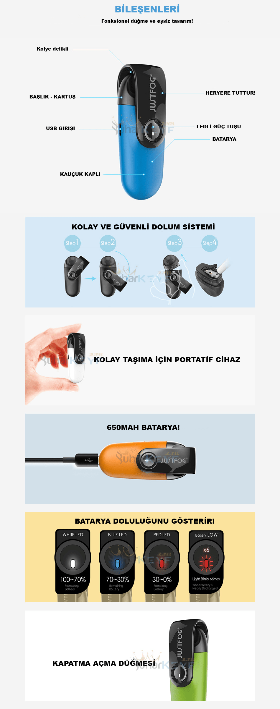 plastik salt likit şişeleri tercih edilir. Gövde üzerindeki lamba,Justfog C601 Pod Mod' un pil seviyesi hakkında bilgi