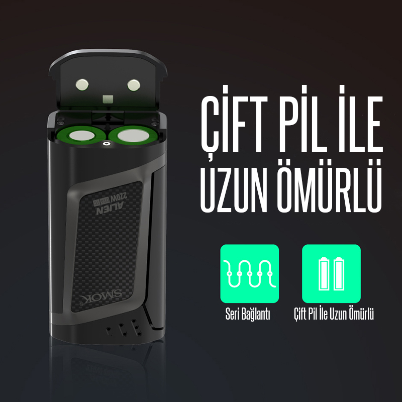 Bu ürün minimum 2 adet 18650 model pil ile çalışmaktadır dilerseniz sitemizden 18650 modeldeki pillerden sipariş verebilir ve Smok Alien Kit 220w cihazınızda kullanabilirsiniz.
