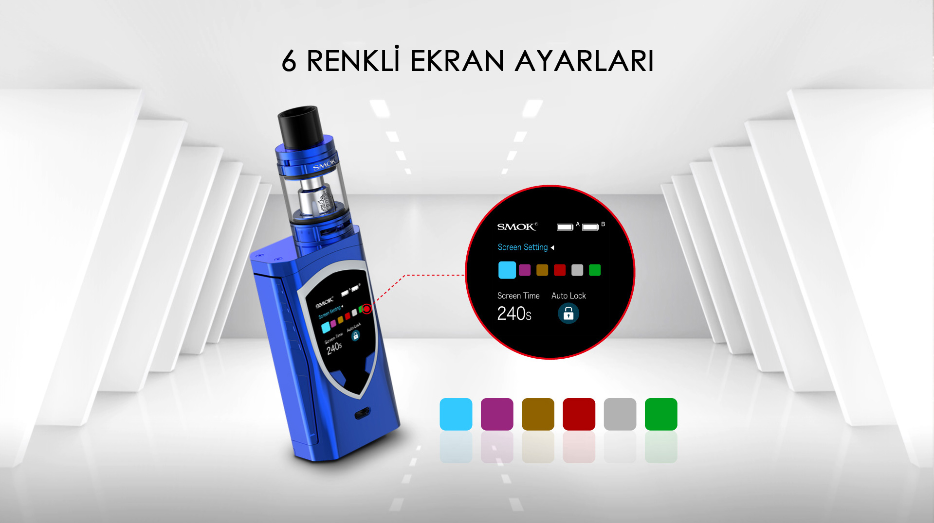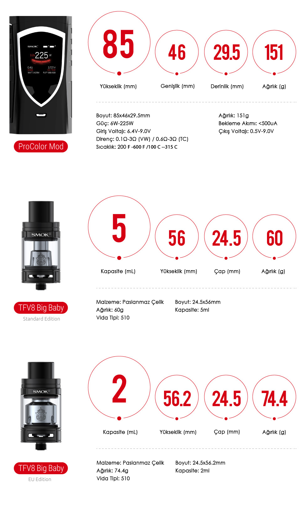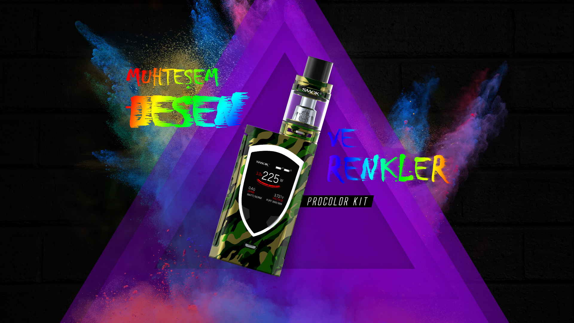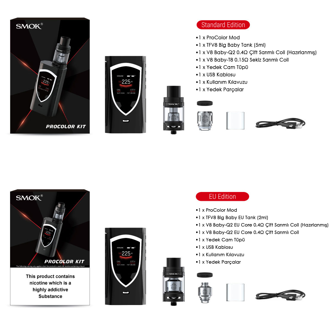 ProColor kiti,endüstrinin önde gelen tasarımına ve yeni özelliklerine sahip olan ProColor,225 watt moduyla birlikte gelir. Bir kalkan gibi şekillendirilmiş RGB LED ışıklara ve yüksek çözünürlüklü 1.3 inç büyüklüğünde bir süper geniş OLED renkli ekrana sahiptir. Ayrıca,tamamen yeni tasarlanmış bir yazılım arabirimine,ergonomik elle hissedilen bir tasarıma sahip ateşleme tuşuna,birlikte verilen sub ohm tankı dünyaca ünlü ve sevilen TFV8 Big Baby tankına sahip. Tüm bu özellikler size mükemmelliği kendinizde gösterecek,yenilik vaping deneyimini değiştirmeye devam ediyor!