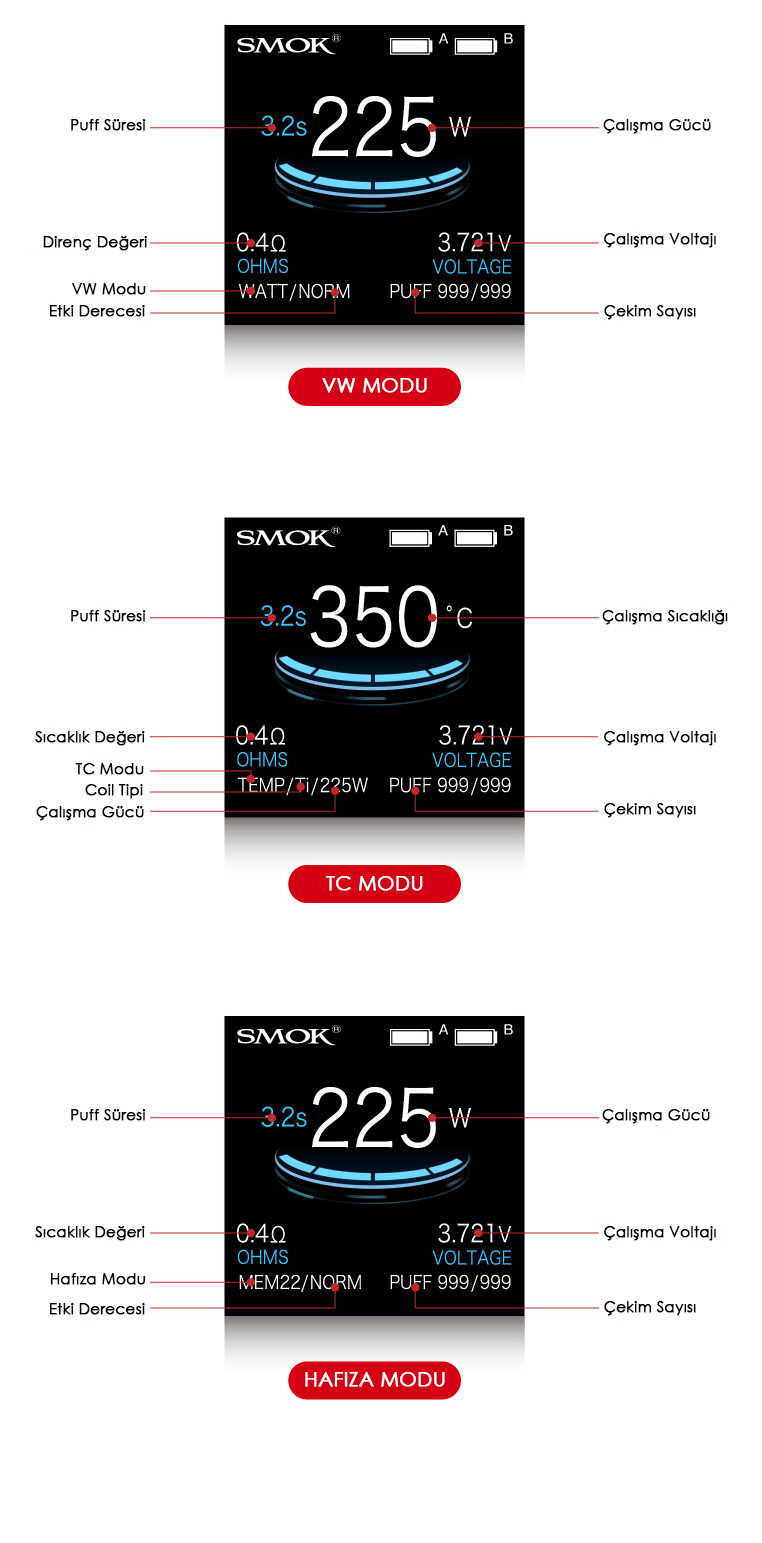 OLED ekranı tamamen yeni çalışma arabirimi ile birleşiyor. VW / TC MODE,puff göstergesi,voltaj,pil ömrü,direnç değeri vs. gibi sizin için daha fazla vaping verisi.